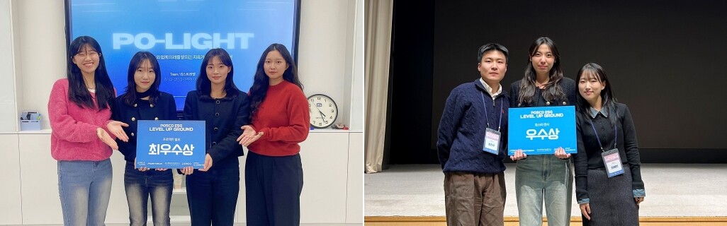 가톨릭대 학생들이 ‘포스코 지속가능 레벨업그라운드’에서 최우수상(왼쪽)과 우수상을 수상했다. 사진=가톨릭대 제공 |