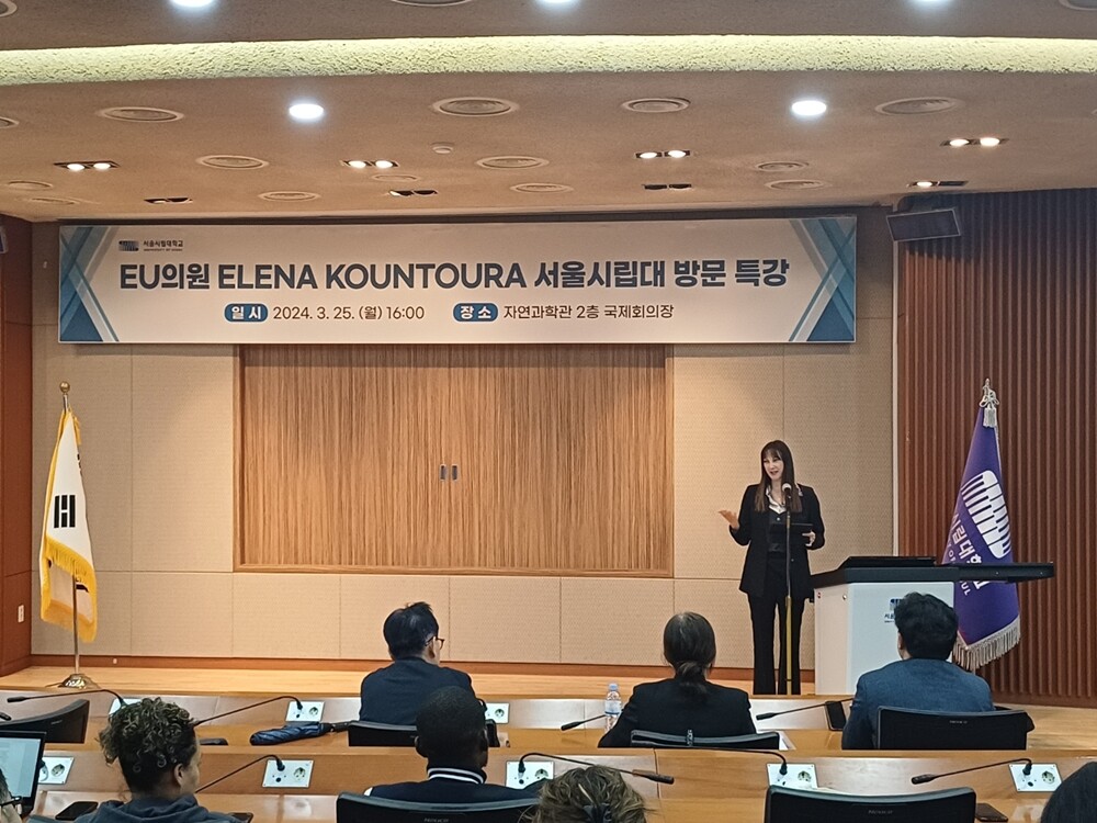 [대학저널 온종림 기자] 서울시립대학교가 지난 25일 엘레나 쿤투라(Elena Kountoura) 유럽의회 의원을 초청, 'EU 의회의 시각에서 바라본 지속 가능한 관광'을 주제로 서울시립대 자연과학관 1층 대회의실에서 특강을 개최했다.