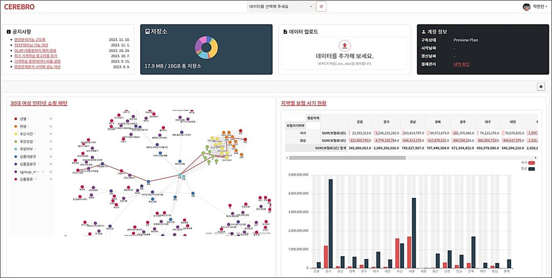 이를 통해 데이터분석 초보자들도 세레브로 솔루션을 사용하여, 보다 편리하게 데이터 웨어하우징부터 기계학습까지 사용자가 직접 데이터를 읽어 들여서 탐색하고 다차원 관점분석 및 연관분석을 통해 인공지능 모델을 생성하는 원스톱 셀프 분석이 가능하다.