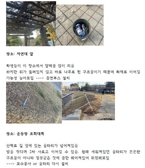 학생들 스스로 캠퍼스 환경 위험 요인들을 분석하고 해결방안을 도출한 이 자료들은 관련 부처에 전달할 예정이다.