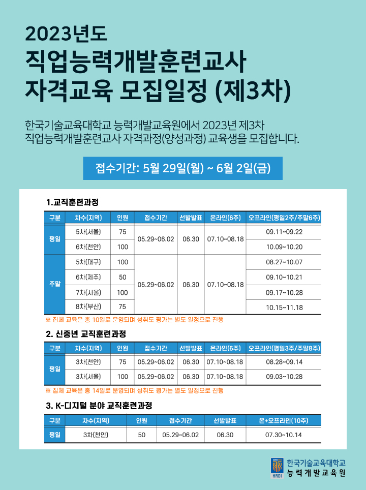22일 한기대에 따르면 자격교육 과정은 직업훈련교사 자격증 신규 취득을 위한 교직훈련과정과 교사 등급의 승급을 위한 향상과정으로 구분되며, 이번 3차 모집에는 교직훈련과정 교육생만을 모집한다.