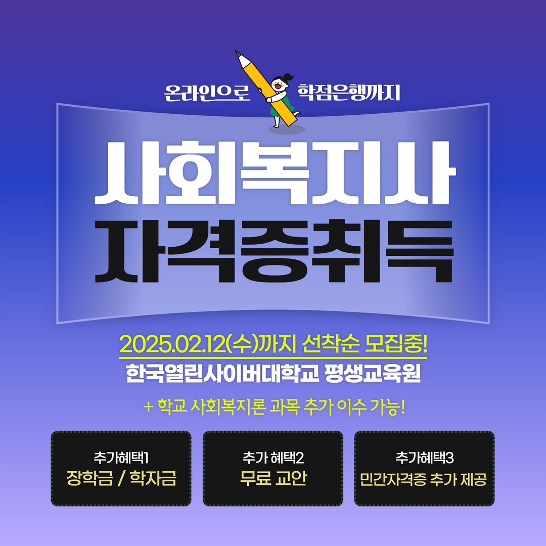 한국열린사이버대학교 평생교육원은 2월 13일(목)에 개강하는 사회복지사2급 자격과정에 대한 수강생을 오는 12일(수)까지 모집한다고 소식을 전했다.