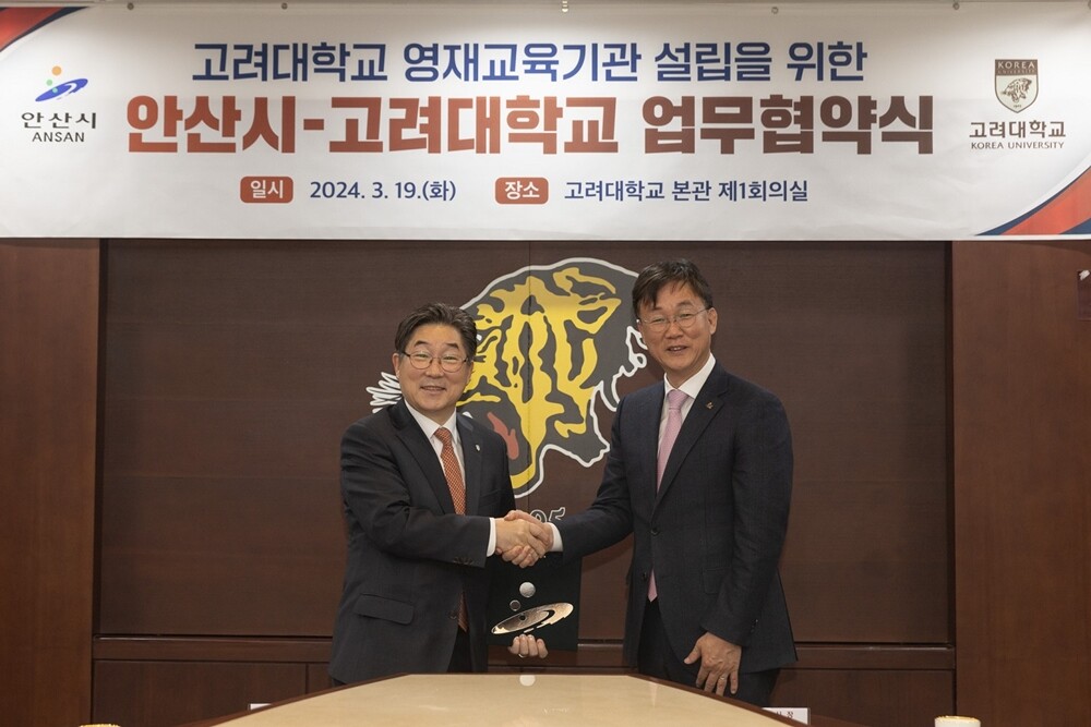 고려대학교는 안산시와 19일 미래 인재 양성을 위한 영재교육기관 설립을 위한 업무 협약을 체결했다.