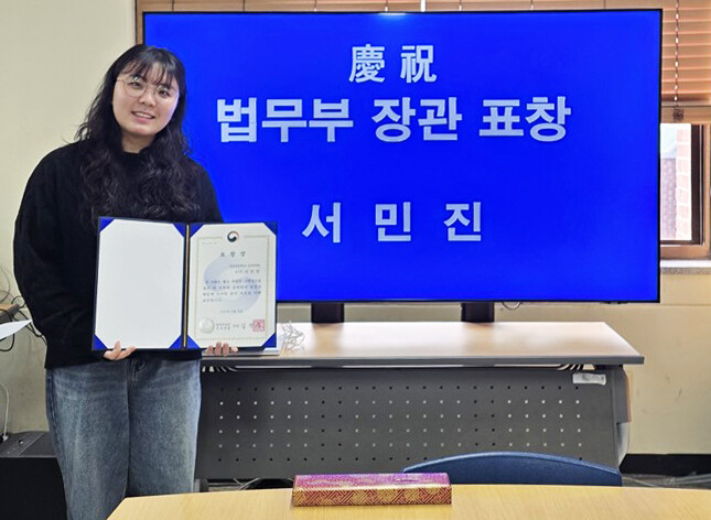경상국립대 건축학과 서민진 씨가 법무부 장관 표창을 수상한 후 기념촬영을 하고 있다. 사진=경상국립대 제공 |