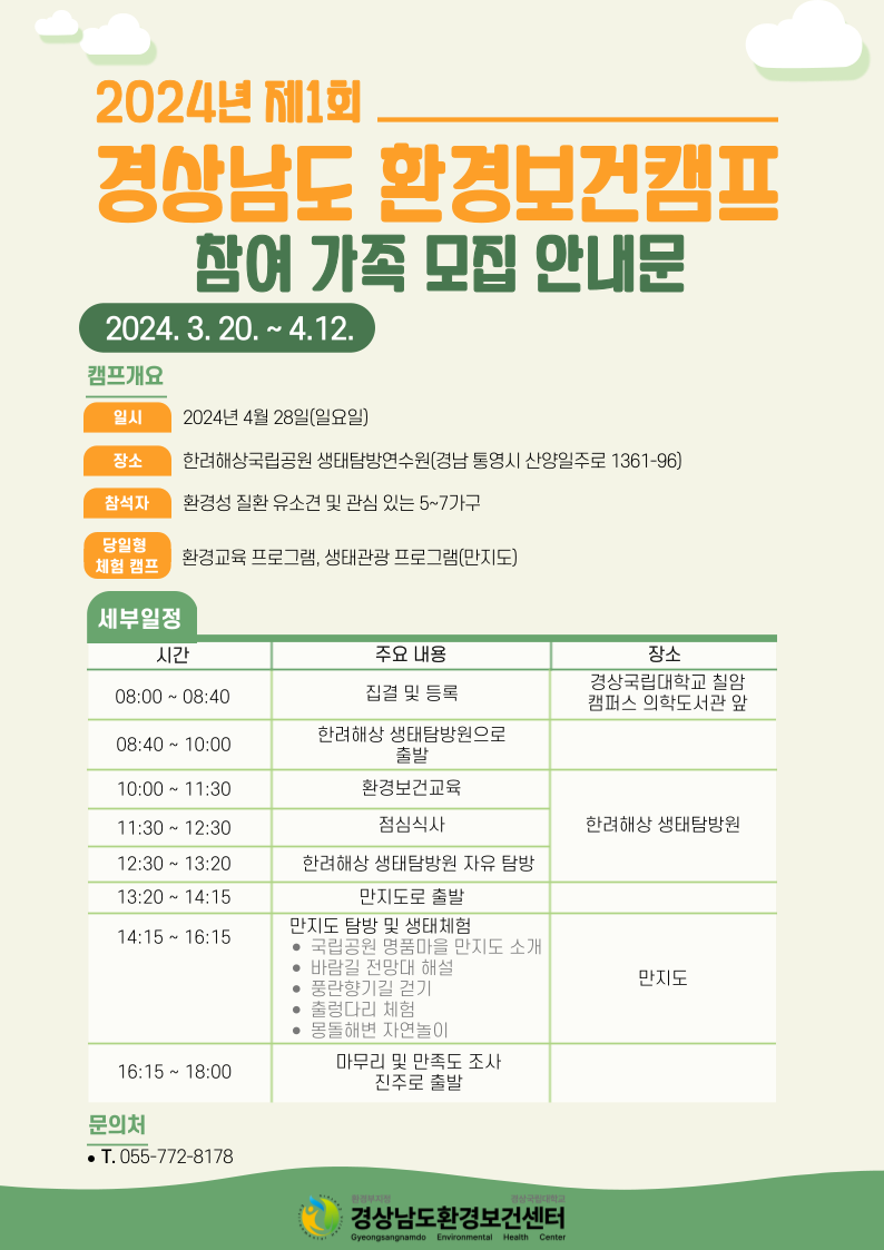 [대학저널 이선용 기자] 경상국립대학교 경상남도 환경보건센터가 아토피·천식·비염 등 환경성 질환으로 어려움을 겪거나 관심이 있는 어린이와 그 가족이 참여하는 ‘2024년 제1회 경상남도 환경보건캠프’를 4월 28일 통영 한려해상국립공원 생태탐방연수원에서 운영한다.