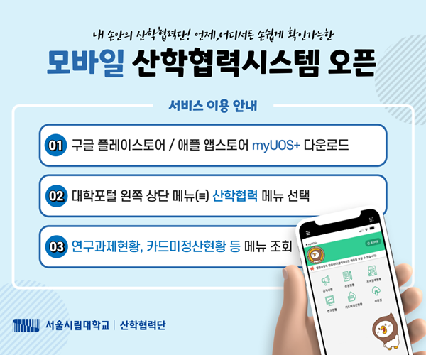 [대학저널 온종림 기자] 서울시립대학교가 연구자 중심의 연구행정 서비스를 대폭 개선한 ‘모바일 산학협력시스템’을 19일부터 정식 운영하고 있다. 이번 시스템 도입으로 연구자들은 연구 현황 조회 및 연구 행정 업무를 보다 편리하게 확인할 수 있게 된다.