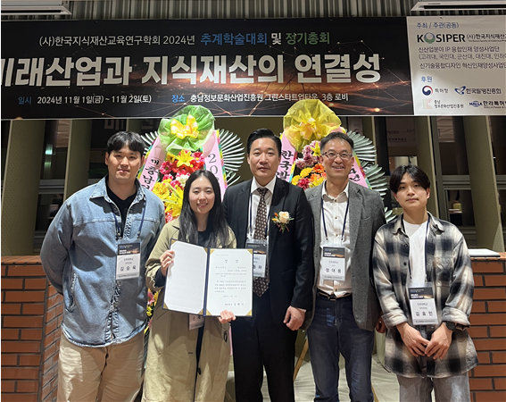 | 왼쪽부터 한국지식재산교육연구학회 우수논문상 수상자인 김승욱 박사과정 학생, 손예지 석사과정 학생, 김효민 학부연구생과 정대용 교수, 김동하 한국지식재산교육연구학회 회장. |