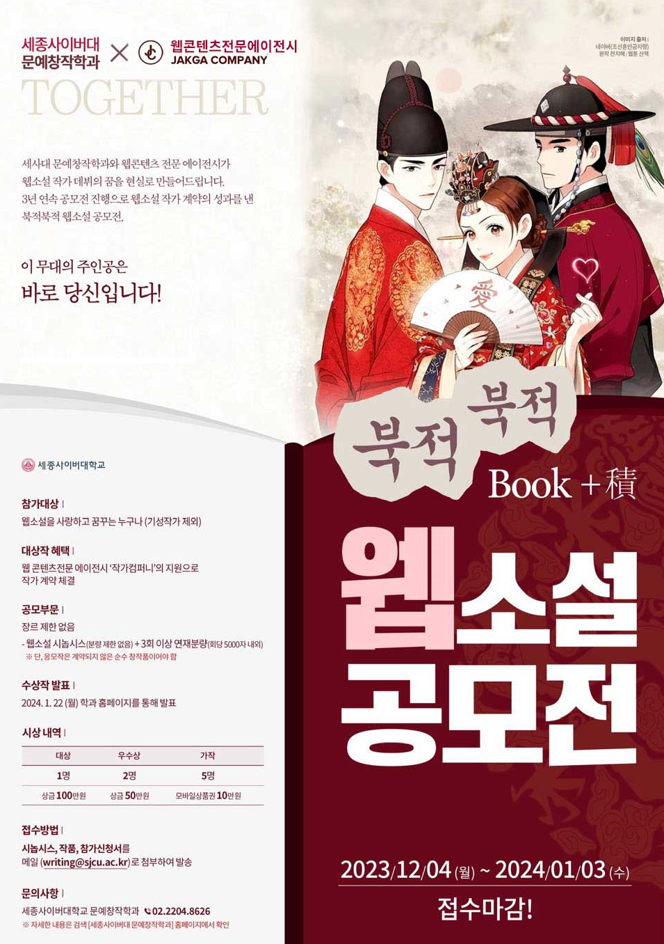 [대학저널 이선용 기자] 세종사이버대학교 문예창작학과가 일반인들의 글쓰기를 응원하고 창작 문화 확산에 기여하기 위해 ‘제3회 북적북적 웹소설 공모전’을 진행한다.