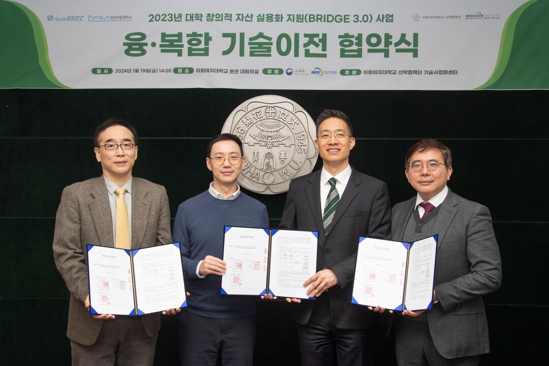 왼쪽부터 이준성 이화여대 산학협력단장, 이혁진 이화여대 교수, 김세준 (주)서지넥스 대표, 박선종 경상국립대 본부장. 사진=이화여대 제공 |