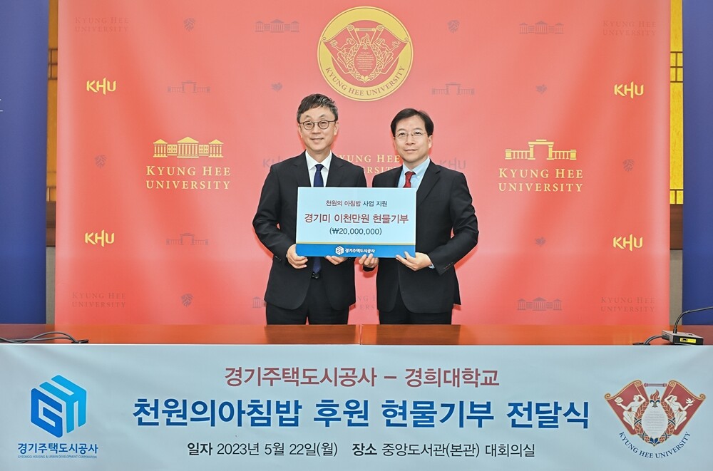 김세용 경기주택도시공사 사장은 "두 달 전 천원의 아침밥 사업에 대해 알게 됐다. 중앙 정부와 대학이 매칭돼 재원을 부담한다는 사실을 듣고 기업이 도움을 줄 방법은 없을까 고민 끝에 현물 기부를 결정하게 됐다. 앞으로도 경기도에서 발생한 이익을 의미 있게 쓸 기회를 지속 찾아볼 것"이라고 말했다.