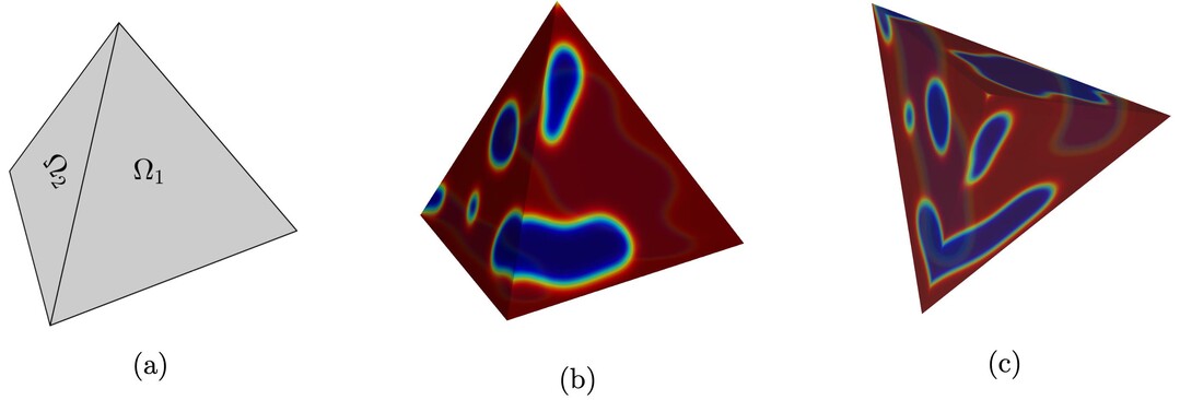 (a)는 사면체의 표면을 도메인으로써 나타낸다. (b)와 (c)는 각 면의 시간에 대한 미분 차수가 정수 차수로 동일한 경우로 동질한 도메인에서의 상분리 시뮬레이션 결과이다. |