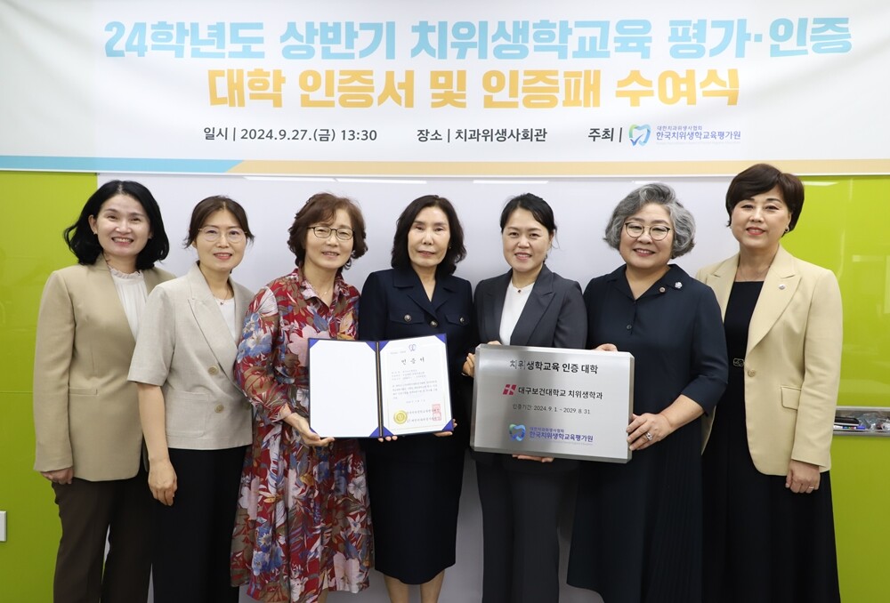 [대학저널 온종림 기자] 대구보건대학교 치위생학과가 영남권에서 유일하게 치위생학교육 평가·인증대학으로 선정됐다. 대학은 27일 서울 치과위생사회관에서 대한치과위생사협회 한국치위생학교육평가원으로부터 치위생학교육 평가·인증대학 인증서와 인증패를 수여받았다.