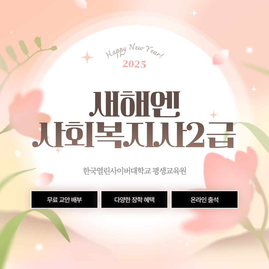 한국열린사이버대학교 평생교육원은 2025년 1월 16일에 개강하는 사회복지사 2급 자격증 취득 과정을 준비하며, 수강생을 2025년 1월 15일까지 모집한다.