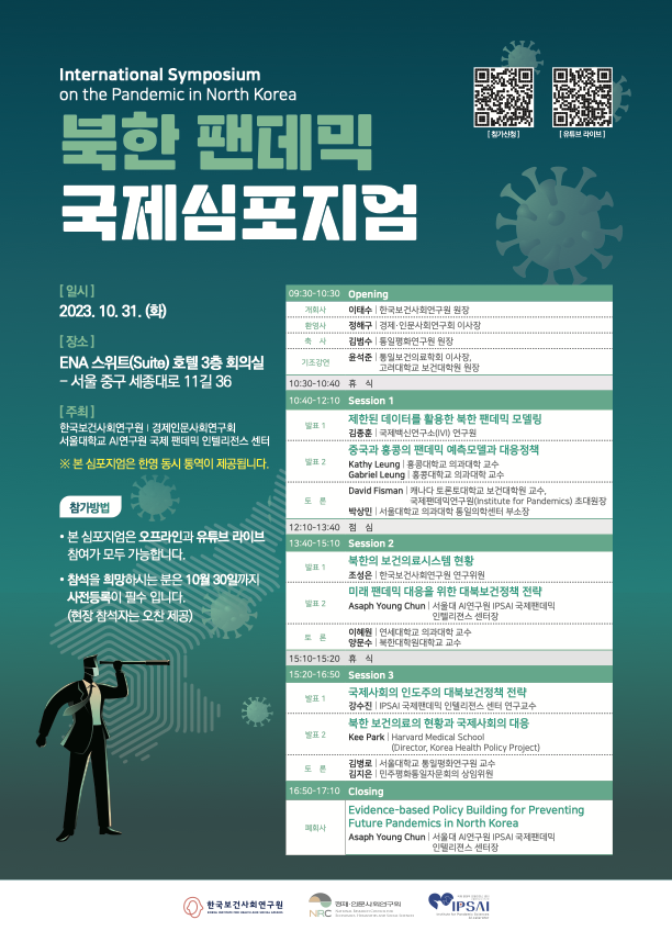 전영일 IPSAI 센터장은 “이번 국제심포지엄에서는 캐나다 토론토 보건대학원, 하버드 의과대학, 홍콩 의과대학 및 한국의 팬데믹 의과학·AI·데이터과학·정책 분야의 석학들이 북한의 코로나19 평가와 미래 팬데믹 대응을 위해 과학과 데이터에 근거한 심층분석과 실용적인 정책을 제시한다”며 “정부와 산학연의 중장기 대북 보건정책 수립과 데이터 기반 소통의 마중물이 되기를 기대한다”고 말했다.