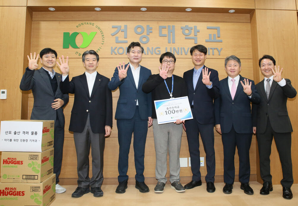 건양대는 정용현 주임을 축하하며 출산축하금 100만원과 산모를 위한 건양대병원 건강검진권 그리고 기저귀를 선물했다.