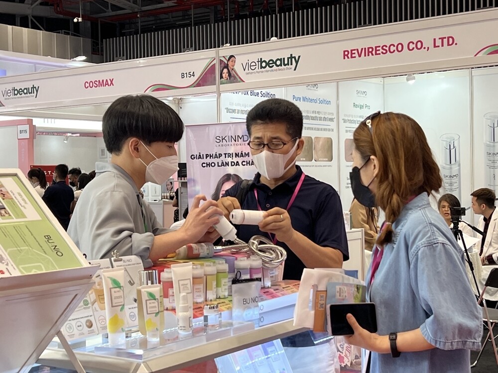 영남대 GTEP사업단 16기 학생들이 베트남 비엣 뷰티 전시회에 참가해 바이어에게 설명을 하고 있다. 사진=영남대 제공 |
