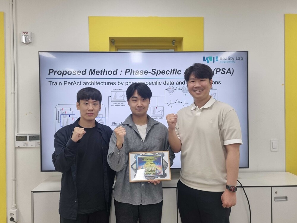 [대학저널 온종림 기자] 숭실대학교 IT대학 글로벌미디어학부 김희원 교수 연구팀(석사과정 이상민, 박성용)이 지난 18일 미국 시애틀에서 열린 ‘인공지능 로봇 조작 챌린지 세계대회(ARNOLD Challenge)'에서 ‘상태 보간을 이용한 단계-특화 에이전트’ 알고리즘으로 3위를 차지했다.
