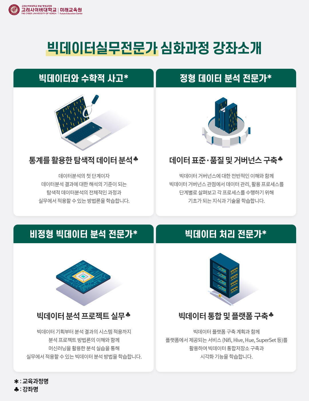 교육과정은 ▲빅데이터와 수학적 사고(강좌명: 통계를 활용한 탐색적 데이터 분석), ▲정형 데이터 분석 전문가(강좌명: 데이터 표준·품질 및 거버넌스 구축), ▲비정형 빅데이터 분석 전문가(강좌명: 빅데이터 분석 프로젝트 실무), ▲빅데이터 처리 전문가(강좌명: 빅데이터 통합 및 플랫폼 구축)로 구성되어 있다.