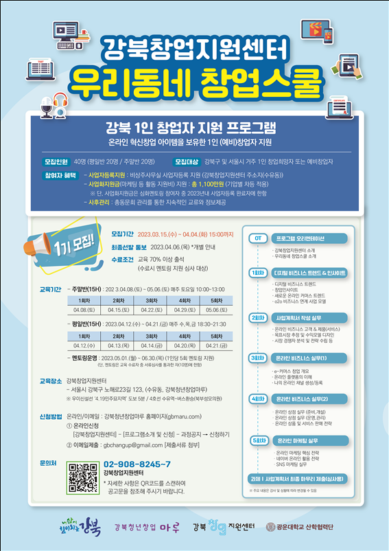 우리동네 창업스쿨 모집 관련 공고 안내는 강북청년창업마루 홈페이지를 통해 확인할 수 있다. 기타 자세한 사항은 강북창업지원센터 운영지원실로 문의하면 된다.
