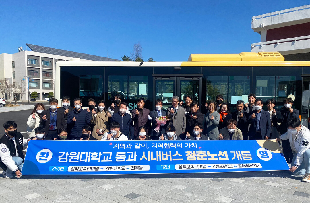 윤정의 부총장은 “교내를 통과하는 시내버스 노선의 개통은 동해시에 거주하는 학생은 물론 KTX를 이용하는 서울·경기권 학생에게 통학 편의와 함께 여가 활동을 즐기는 데 큰 도움이 될 것”이라며 “노선 신설에 도움을 준 삼척시와 강원여객 관계자에게 감사드린다”고 고마움을 전했다.