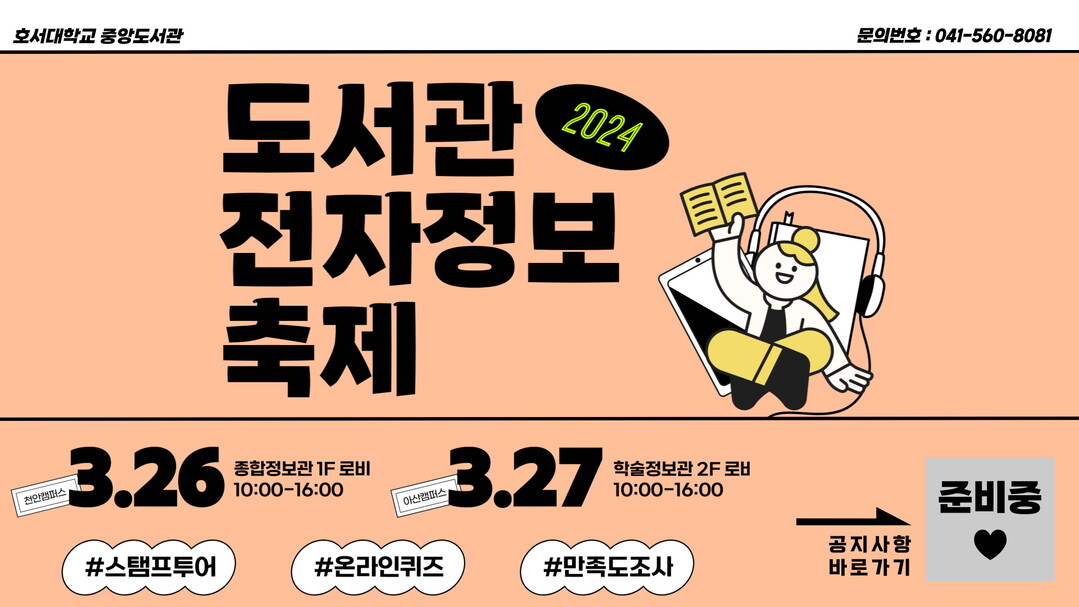 [대학저널 이선용 기자] 호서대학교 중앙도서관은 새 학기를 맞아 3월 26~27일 ‘2024 도서관 전자정보축제’를 개최한다고 12일 밝혔다.