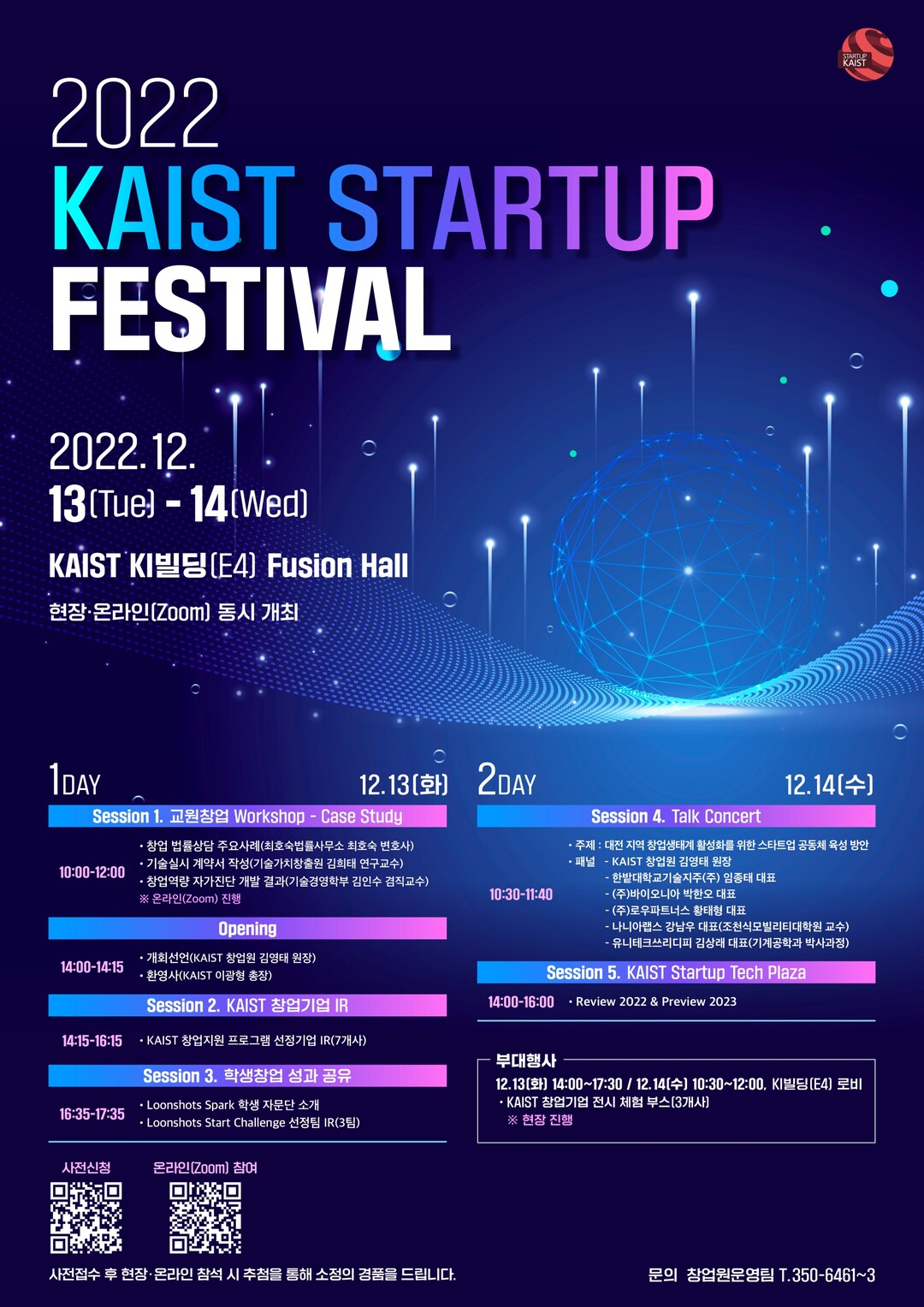 이번 행사는 KAIST 대전 본원의 창업원 K-Space와 KI빌딩 퓨전홀 등에서 현장 진행되고 온라인(zoom)에서도 중계된다. 행사에 관한 자세한 내용 및 온라인 시청 방법은 KAIST 창업원 홈페이지에서 확인할 수 있다.