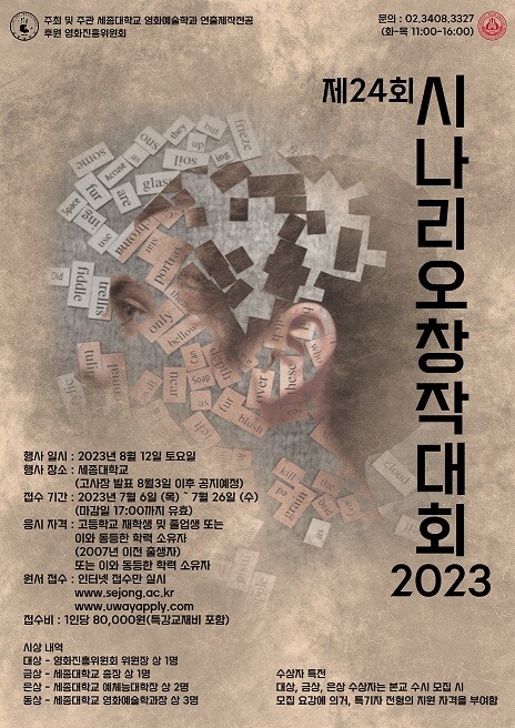 원서접수는 6일부터 26일 오후 5시까지이며, 세종대 홈페이지 또는 유웨이어플라이에서 할 수 있다. 자세한 내용은 세종대 영화예술학과로 문의하면 된다.
