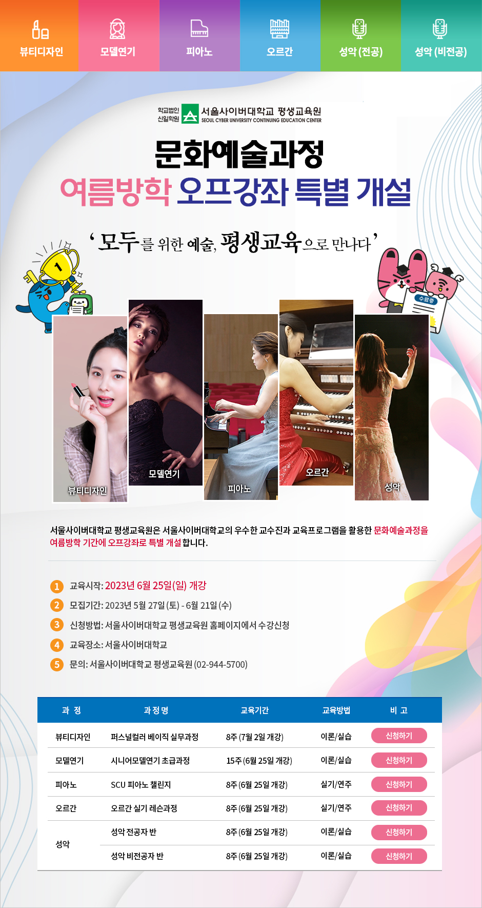 개설되는 강좌는 뷰티와 모델연기, 피아노, 오르간, 성악이다.