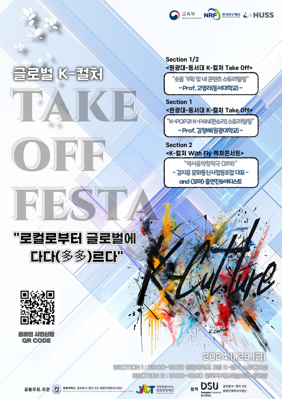 ‘테이크오프페스타’는 인문사회융합인재양성사업(HUSS) 글로벌 K-컬처 컨소시엄 참여 대학과 더불어 참여대학이 속한 지역인 전북자치도 익산, 충남 천안, 경기 이천, 충남 서산, 부산 지역의 문화단체가 상호 기관의 전문성을 연결하고, 글로벌 K-컬처 가치를 제고하기 위한 통합 비교과 프로그램으로, 3주에 걸쳐 펼쳐진다.