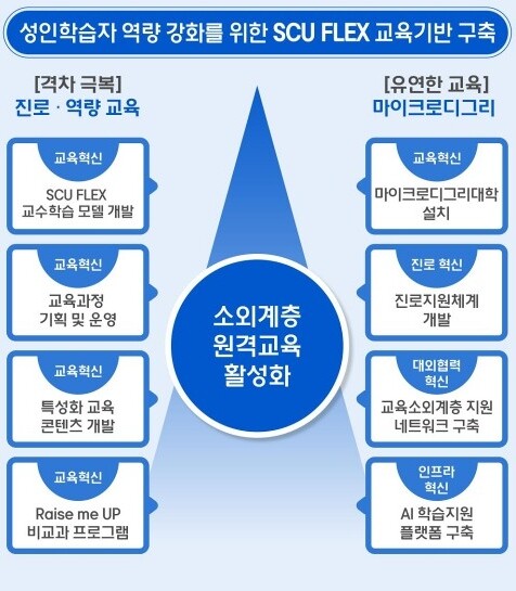 사업에 선정된 4개 대학은 3년간 매년 3억 5,000만원을 지원받아 교육 소외계층을 대상으로 대학 특성화 기반의 소학위과정(마이크로디그리) 개설 및 교과목 콘텐츠 개발, 교수학습 방법 혁신, 비교과 프로그램 운영, 교수학습 지원 시스템 개선 등 융복합형 교육모델을 개발하고, 이를 대학에 적용 후 확산하여 대학의 교육역량 제고 및 성인의 직무역량 강화와 일·학습 병행을 위한 교육에 기여하게 된다.