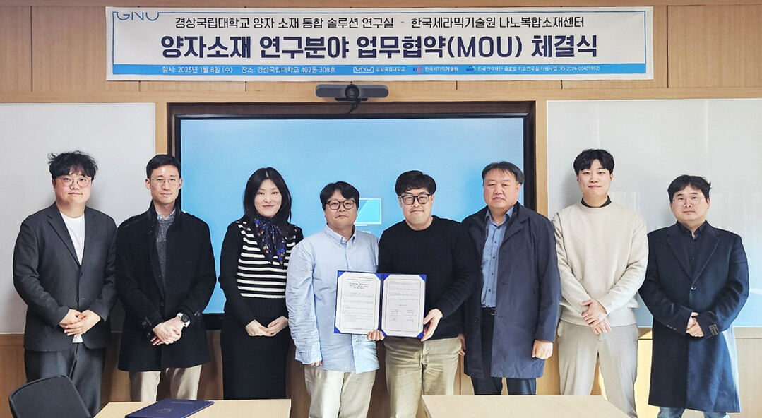 [대학저널 이선용 기자] 경상국립대학교 글로벌기초연구실 양자소재통합솔루션 연구실과 한국세라믹기술원 나노복합소재센터는 1월 8일 경상국립대에서 양자 소재 연구를 위한 상호협력 협약을 체결했다고 10일 밝혔다.