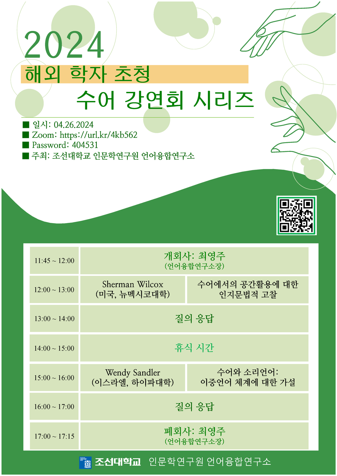 [대학저널 이선용 기자] 조선대학교 언어융합연구소가 오는 4월 26일 ‘2024 해외 학자 초청 수어 강연회 시리즈’로 뉴멕시코 대학(미국) Sherman Wilcox 명예 교수와 하이파 대학(이스라엘) Wendy Sandler 교수의 초청강연회를 개최한다.