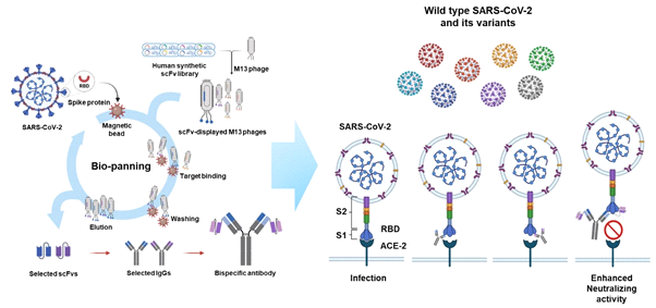 연구팀은 이번 연구에서는 확립된 항체라이브러리에서 바이러스 특이적 단클론항체 선별과 이중항체를 빠르게 개발하고 생화학적, 분자생물학적, 바이러스학적 효능 및 독성 연구를 통해 개발한 이중항체가 단클론항체 보다 다양한 SARS-CoV-2 바이러스 변이종들의 감염을 탁월하게 억제하는 중화 효능을 검증했다.
