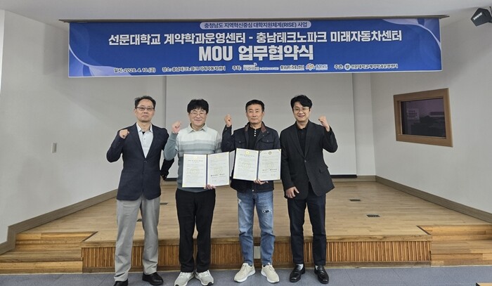 [대학저널 온종림 기자] 선문대학교 계약학과운영센터가 지난 10일 충남테크노파크 미래자동차센터와 ‘충청남도 RISE 협력 관계 구축 및 충남형 계약학과 운영 활성화’를 위한 업무협약(MOU)을 체결했다.