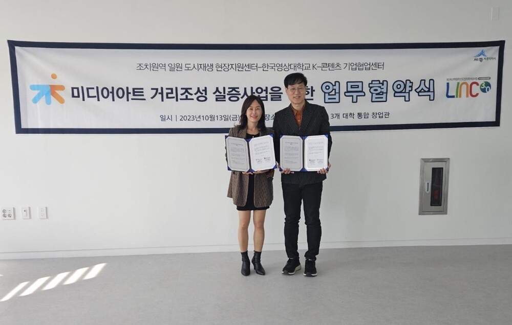 [대학저널 온종림 기자] 한국영상대학교 K-콘텐츠 기업협업센터(이하 ICC)가 도시재생 현장지원센터와 업무협약을 체결했다. ICC와 현장지원센터는 지역의 미디어 기업과의 협업을 통해 미디어아트를 활용한 거리 활성화 사업을 함께할 예정이다.