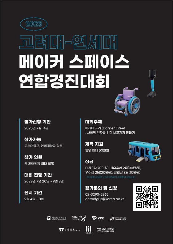 대회 주제는 배리어 프리(Barrier-Free)로 ‘사회적 약자를 위한 보조기기 만들기’로, 팀별 계획서를 제출하면 평가를 거쳐 대학별 4팀을 선발한다. 선발된 팀은 고려대와 연세대의 메이커 스페이스 시설과 장비를 활용해 1개월 동안 시제품을 제작할 수 있다.