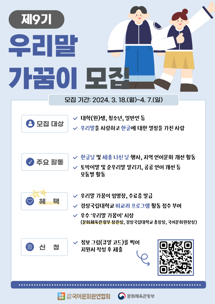 지원을 원하는 대학생과 일반인은 4월 7일까지 정보그림(큐알코드)을 찍어 네이버 폼에서 지원서를 작성, 제출하면 된다. 합격자는 4월 9일 경상국립대 국어문화원 누리집에 게시된다.