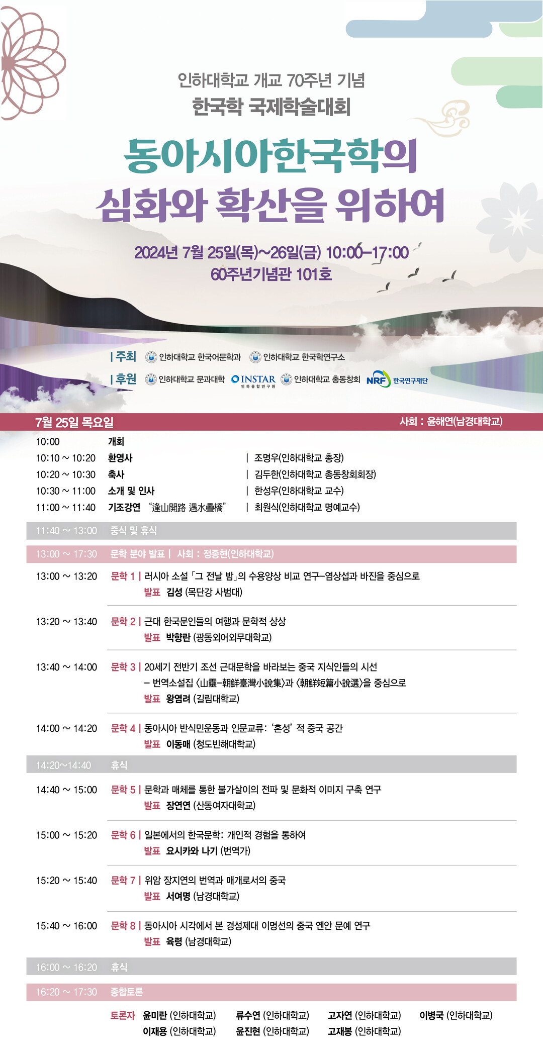 국제학술대회 1일차인 25일엔 최원식 인하대 한국어문학과 명예교수가 ‘봉산개로 우수첩교(逢山開路 遇水疊橋)’를 주제로 기조 강연에 나선다. 기조 강연을 시작으로 중국, 일본에서 활동하는 동문학자들이 한국문학과 관련한 발표를 진행할 예정이다. 인하대 대학원 출신 한국 연구자들은 한국문학의 쟁점을 진단하고 새로운 연구 방향에 대해 토론하는 시간을 가진다.