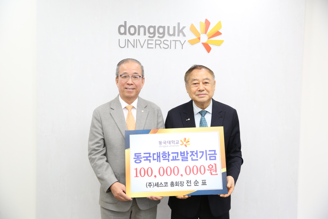 [대학저널 이선용 기자] 동국대학교는 지난 11월 5일, 본관 총장 접견실에서 ㈜세스코 전순표 총회장(농학 53학번)으로부터 1억 원의 발전기금을 전달받았다고 11일 밝혔다. 이번 기부금은 로터스관 건립기금으로 사용될 예정이다.
