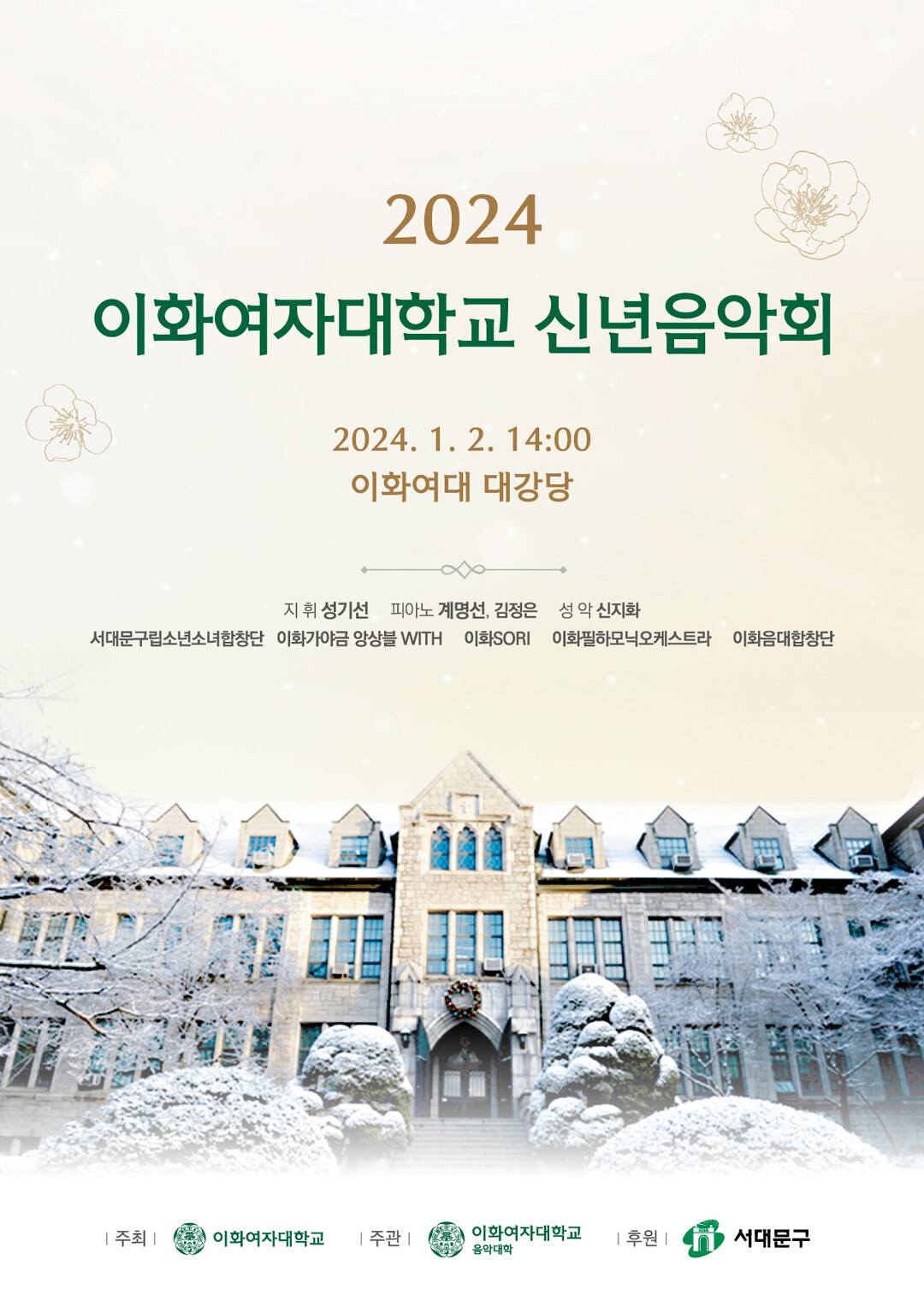 이화여대가 주최하는 이번 음악회는 청룡의 해 ‘갑진년’을 맞아 지역사회와 함께 하기 위해 처음으로 서대문구민을 초청해 열리는 음악회로 마련된다. 1925년 한국 최초 음악과로 시작해 역사와 전통을 자랑하는 이화여대 음악대학의 교수, 재학생, 졸업생이 총출동해 이화필하모닉오케스트라, 이화음대합창단, 가야금앙상블, 한국음악 성악 앙상블 등 수준 높은 연주자들이 공연을 선보인다.