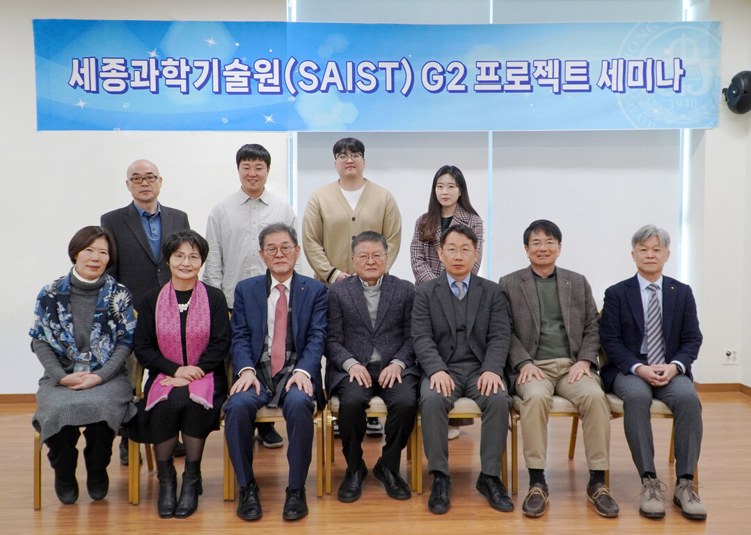 세종대 대양AI센터에서 개최된 세종과학기술원(SAIST) G2 프로젝트(첨단신약개발) 세미나 참석자들이 기념촬영을 하고 있다. 사진=세종대 제공 |