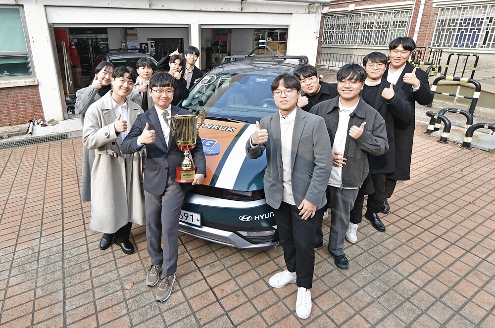 지난달 10일 경기 용인시 스피드웨이에서 열린 ‘현대자동차그룹 자율주행 챌린지’에서 건국대 로고와 ‘AutoKU-R’ 팀명을 붙인 아이오닉5가 자율주행을 시작했다. 속도는 최대 시속 130km까지 올랐다. 내내 선두를 지킨 AutoKU-R팀의 차량은 끝내 우승을 차지해 상금 1억원과 함께 현대자동차그룹 채용 특전과 미국 현대차 연구소 견학 기회를 얻었다.