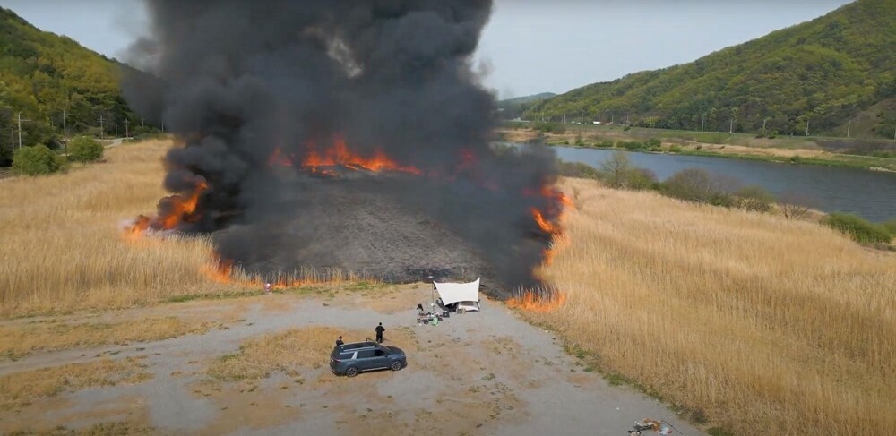 한국영상대 영상촬영조명학과 주민수 학생이 공주시 일대 한 갈대밭에서 발생한 산불을 드론으로 촬영한 모습. 주민수 학생이 드론으로 촬영함과 동시에 발빠른 대응으로 큰 산불로 이어지지는 않았다. |