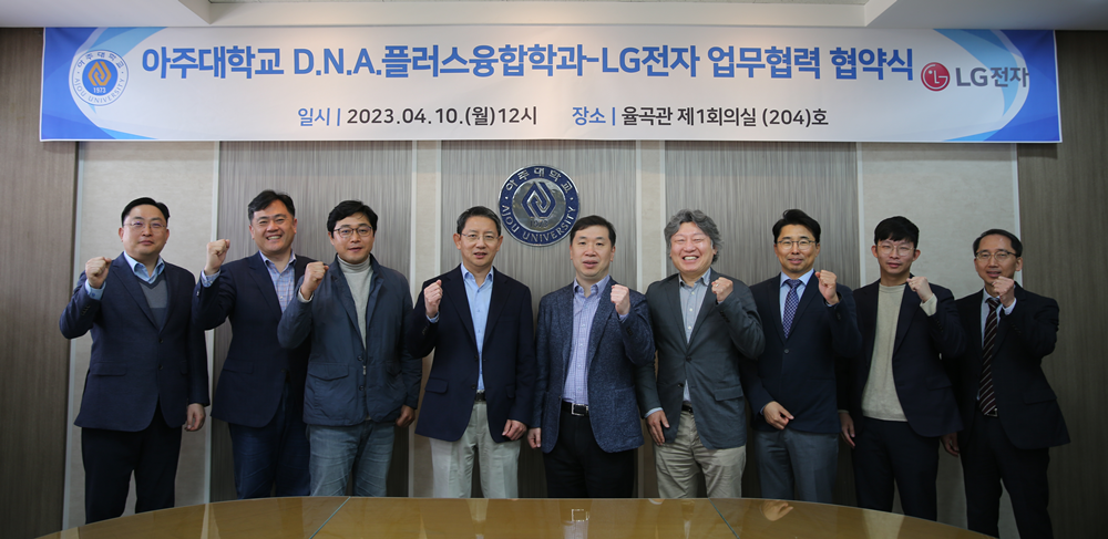 아주대 국토교통 DNA+ 융합기술대학원과 LG전자 VS사업본부가 10일 아주대 율곡관에서 ‘LG전자 DNA+ 융합 트랙’ 신설 운영 협약을 체결했다. 사진=아주대 제공 |