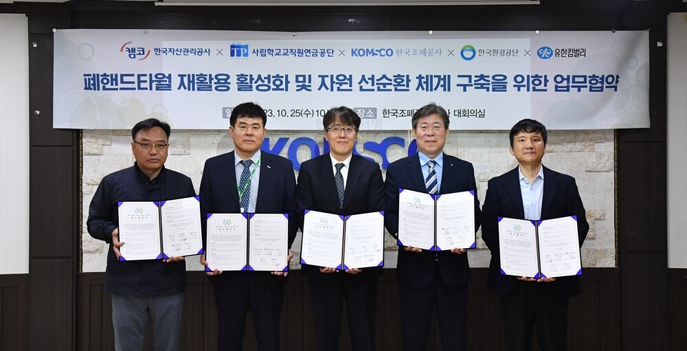 [대학저널 온종림 기자] 사립학교교직원연금공단이 25일 한국조폐공사 본사(대전)에서 한국조폐공사, 한국자산관리공사, 한국환경공단, 유한킴벌리와 폐핸드타월 재활용 선순환 체계 구축을 위한 업무협약’을 체결했다.