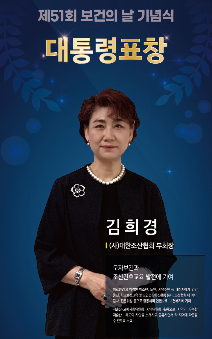 보건복지부가 주최한 행사에서 김 교수는 투철한 사명감과 헌신적인 봉사활동으로 모자보건과 조산간호교육 발전 및 국민보건 향상을 통해 국가 사회발전에 이바지한 공로를 인정받아 수상했다.