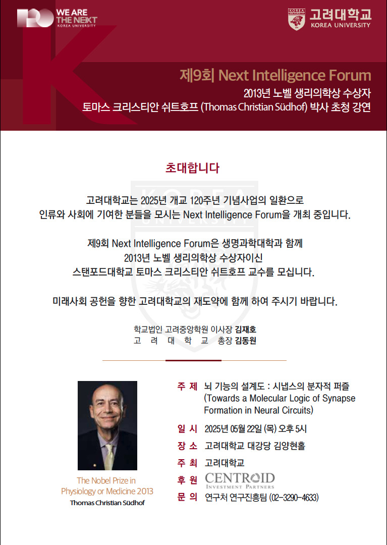 한편, NIF는 고려대 개교 120주년을 맞이하여 노벨상 수상자 및 사회 저명 인사를 초청해 특강을 진행하는 학술 행사로, 제9회 NIF는 센트로이드 인베스트먼트 파트너스가 후원하고 삼성전자의 협력으로 마련됐다.