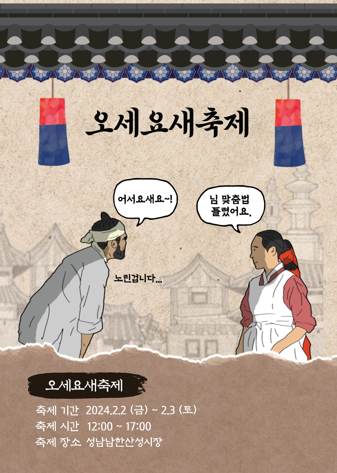 축제기간 동안 시장에는 요새주막이 설치되고, 남한산성 비밀수사단, 성벽젠가, 오세요새 산성이빵, 윷점보기 부스 등이 운영돼 설을 앞둔 시장에 활력을 불어 넣는다.