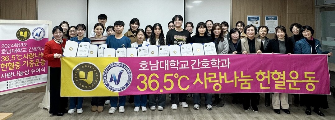 [대학저널 이선용 기자] 호남대학교 간호학과는 12월 11일 교내 2호관(건학관)에서 교수진과 학생 등 40여 명이 참석한 가운데 ‘36.5°C 사랑나눔 헌혈증 기증운동-사랑나눔상 수여식’을 개최했다고 12일 밝혔다.
