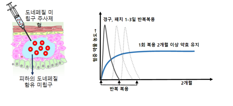 13일 아주대에 따르면 연구팀이 개발한 새로운 제형 시스템을 활용하면 알약과 패치 형태로 하루 또는 사흘 간격으로 복용해야 하는 치매 약물 도네페질 제형을 2개월에 한 번씩 1회 주사로 대체할 수 있다. 기존 방식에 비해 복용 편리성이 대폭 향상될 수 있는 것이다.